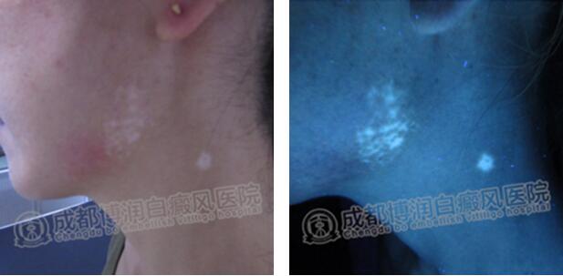 wood灯:颈部有不同程度斑片状色素脱失性白斑,边界不清晰。